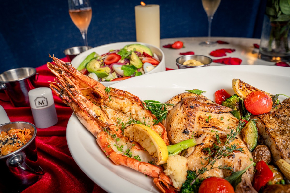 The evening begins with The M’s Salad Bowl, a vibrant sharing dish of Asian shredded vegetables, pickled red onion, Japanese cucumber, chickpeas, fresh avocado, cherry tomatoes, boiled brown rice, corn kernels, coriander, mint, quail eggs, edamame beans and strawberries, finished with golden croutons and a sesame-lime vinaigrette.