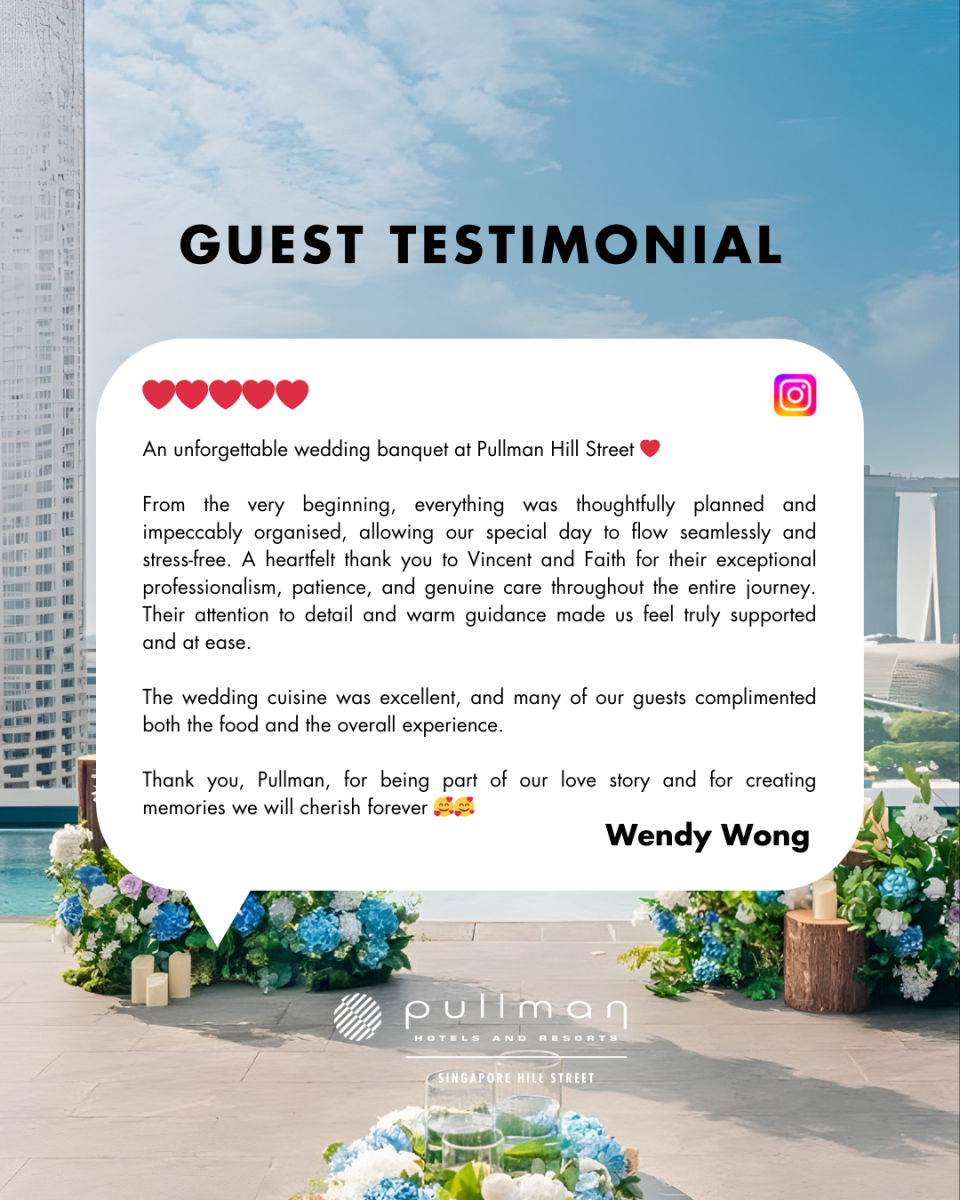 Celebrate your love, while surrounded by family and friends, at our enchanting venues, located within the heart of the city. Our beautiful venues offer unique indoor and outdoor settings, paired with luxurious accommodations to ensure a fuss-free experience on your big day. Our professional wedding experts can design anything, from an intimate solemnization to a fresh alfresco wedding, overlooking the city-skyline, with cocktails and canapes. Design your perfect wedding with us, and explore your dream venue, only at Pullman Singapore Hill Street.